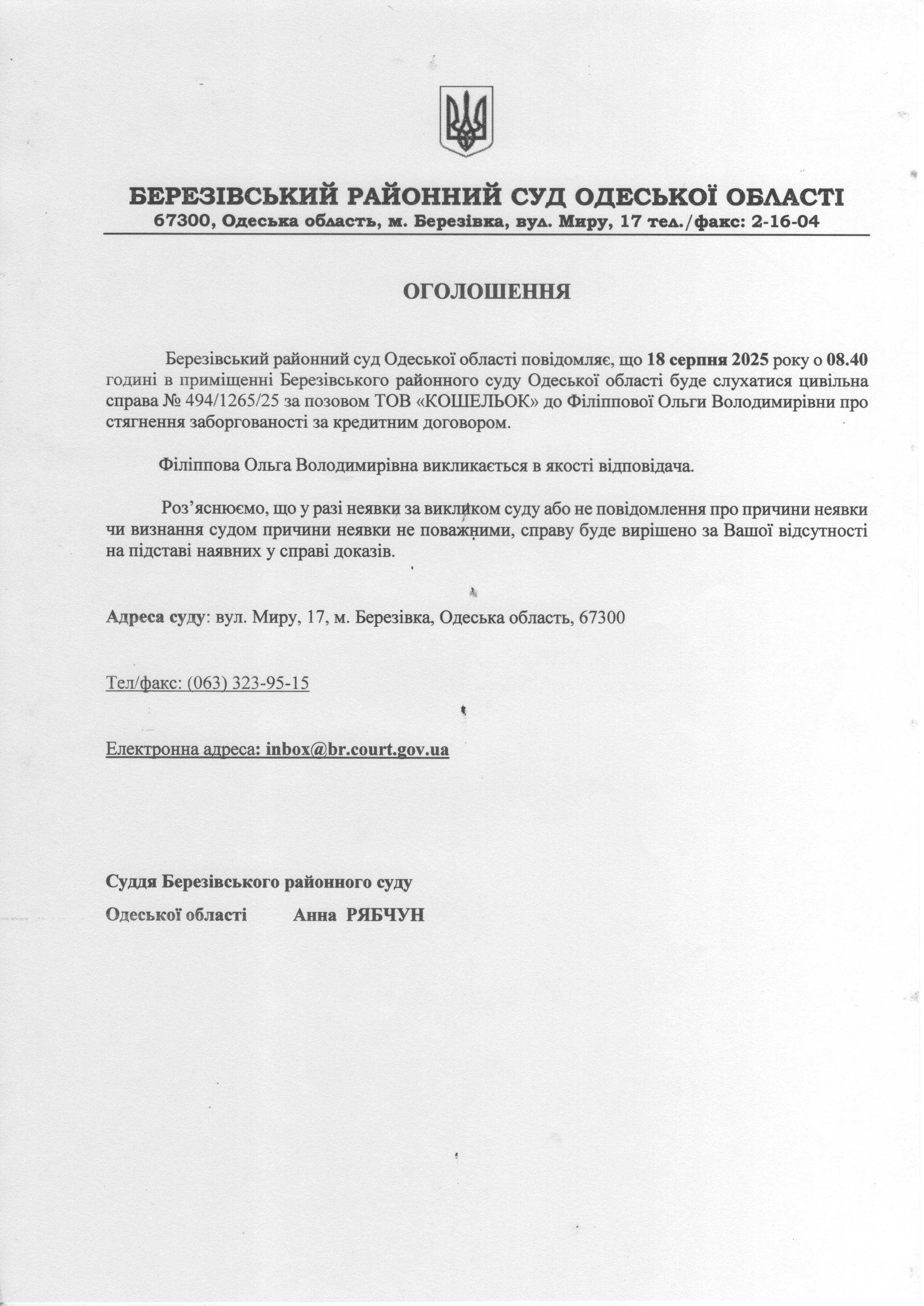 Оголошення про виклик до суду Філіппова Ольга Володимирівна викликається в якості відповідача.