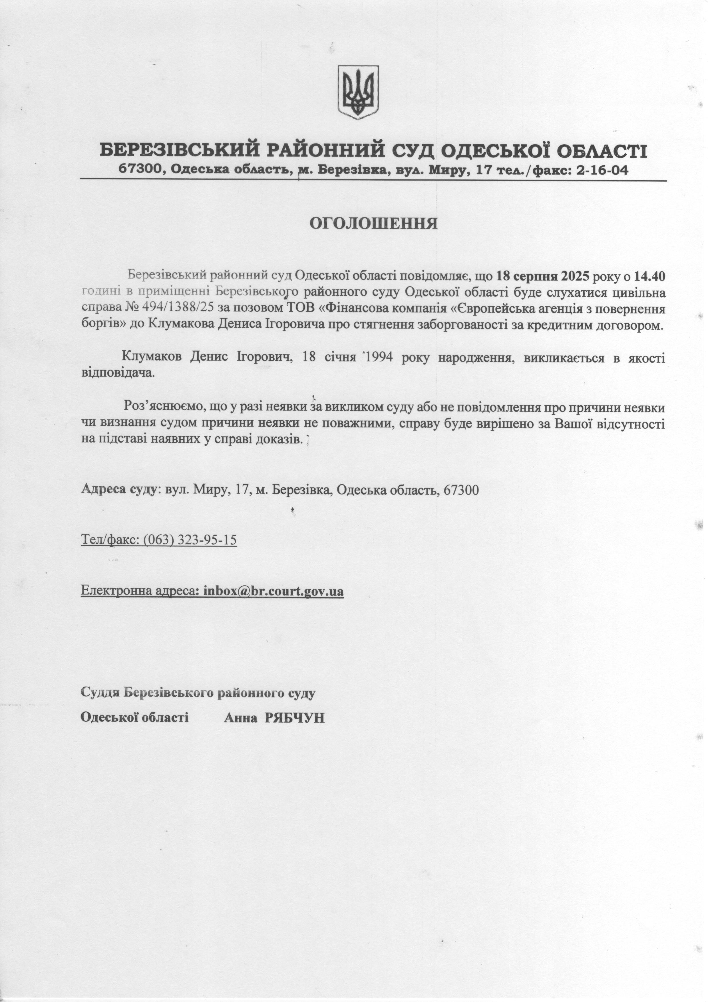 Оголошення про виклик до суду Клумаков Денис Ігорович викликається в якості відповідача.