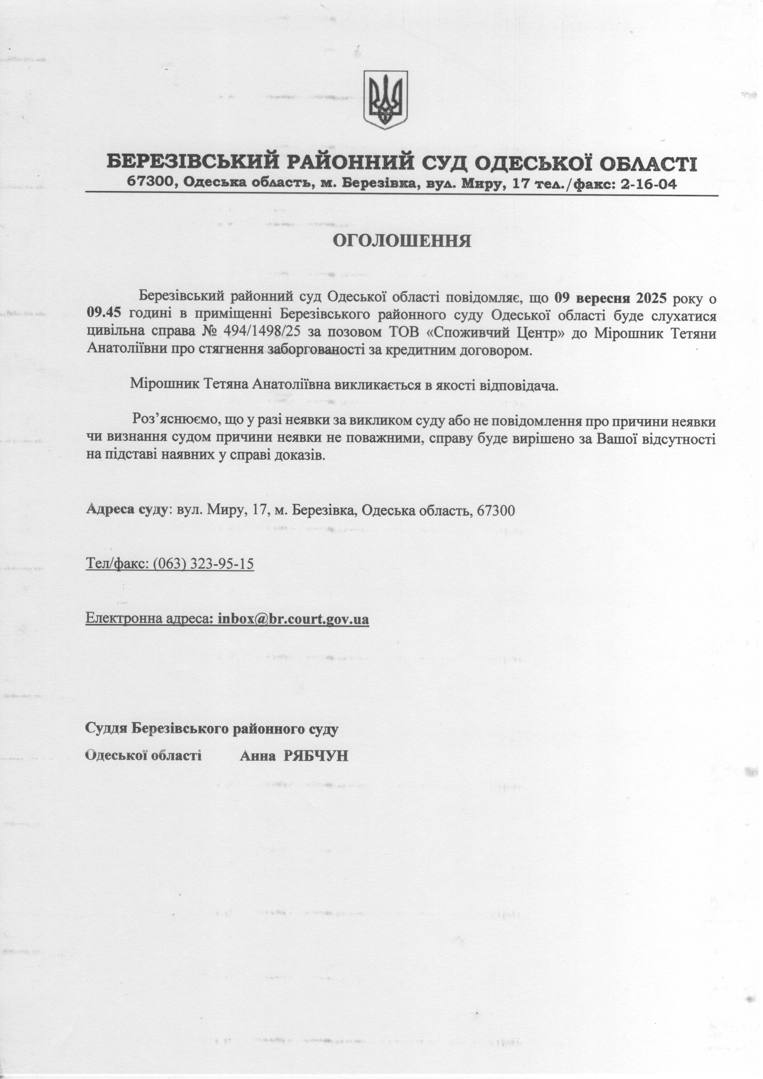 Оголошення про виклик до суду Мірошник Тетяна Анатоліївна викликається в якості відповідача.