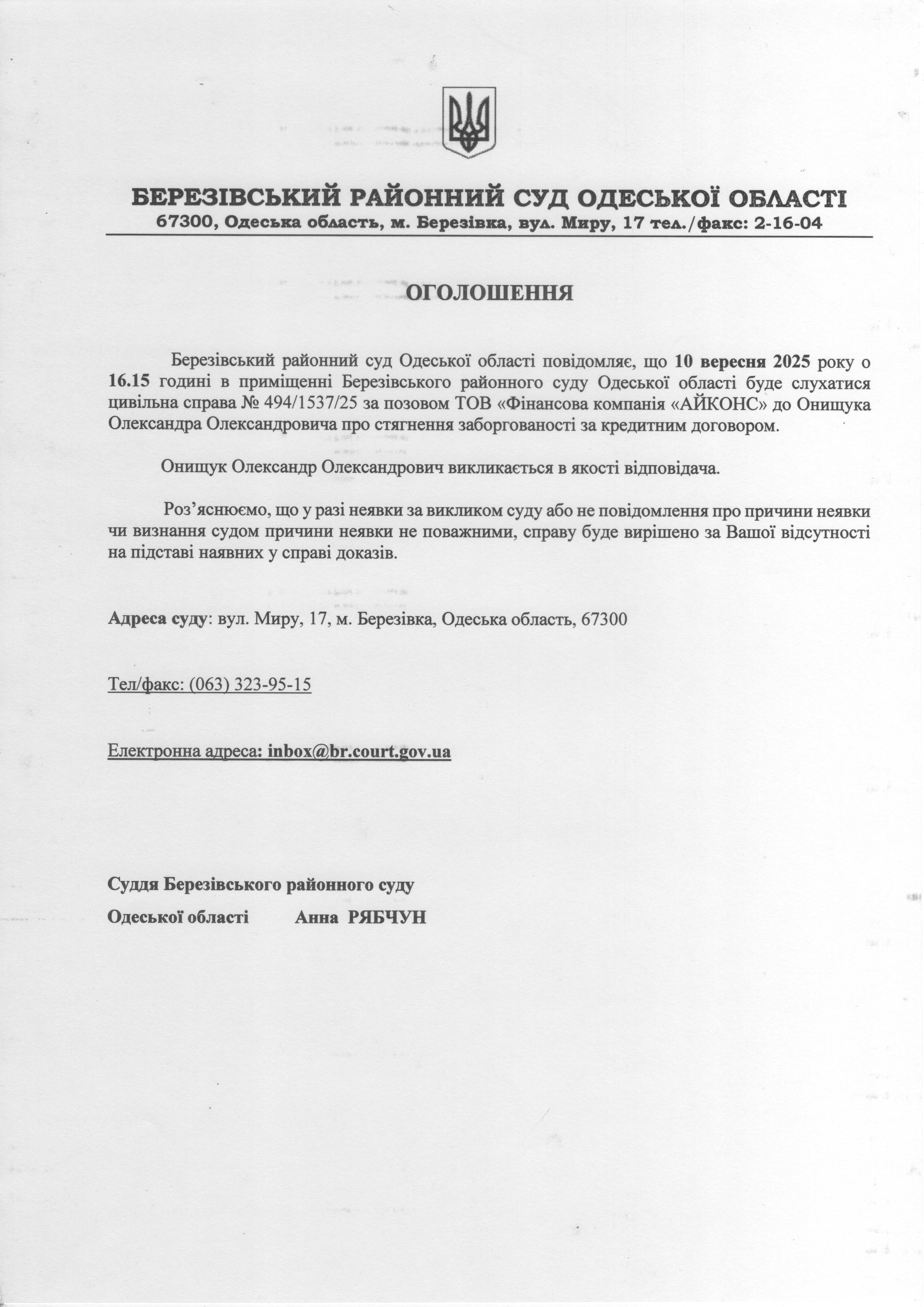 Оголошення про виклик до суду Онищук Олександр Олександрович викликається в якості відповідача.