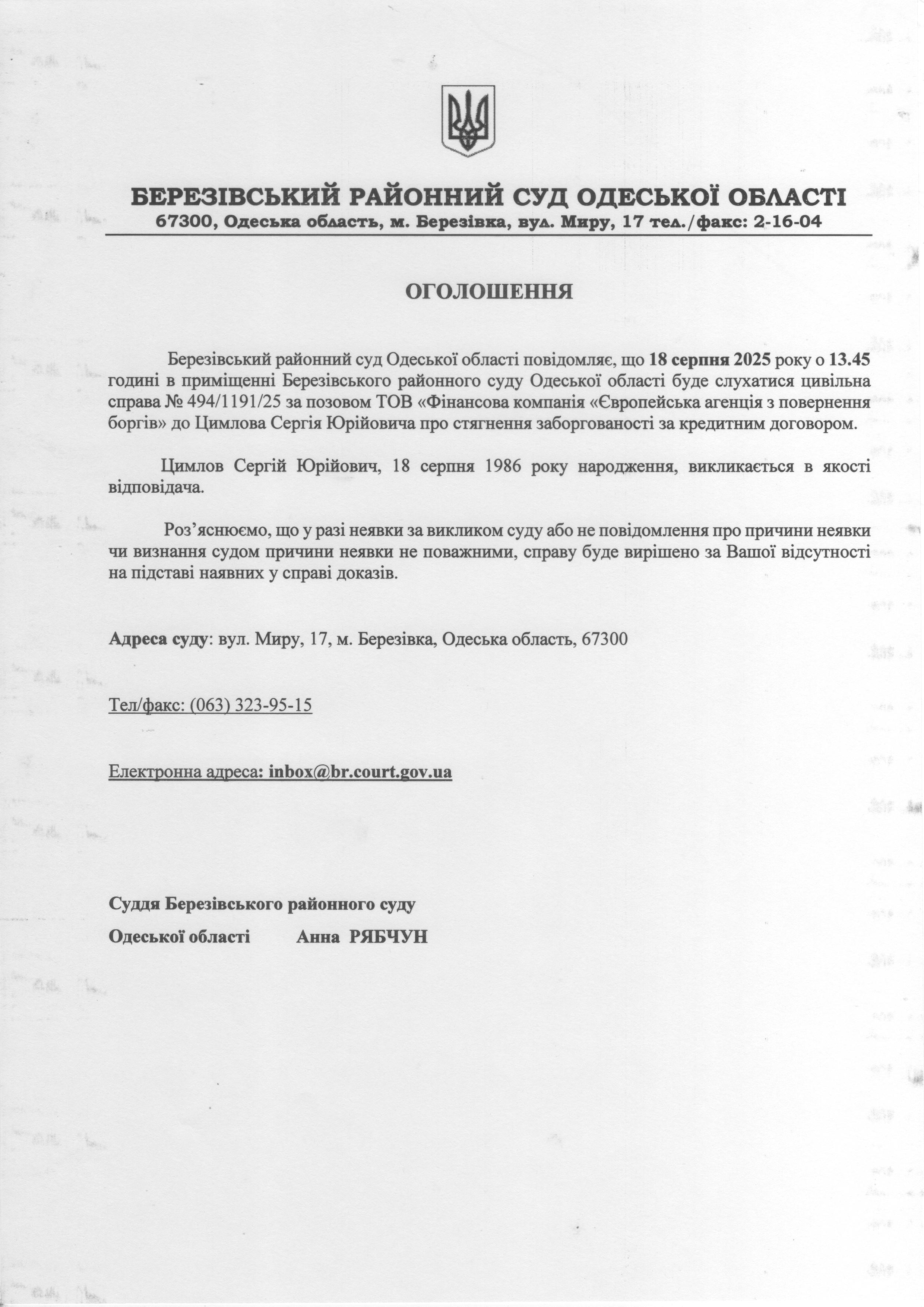 Оголошення про виклик до суду Цимлов Сергій Юрійович викликається в якості відповідача.