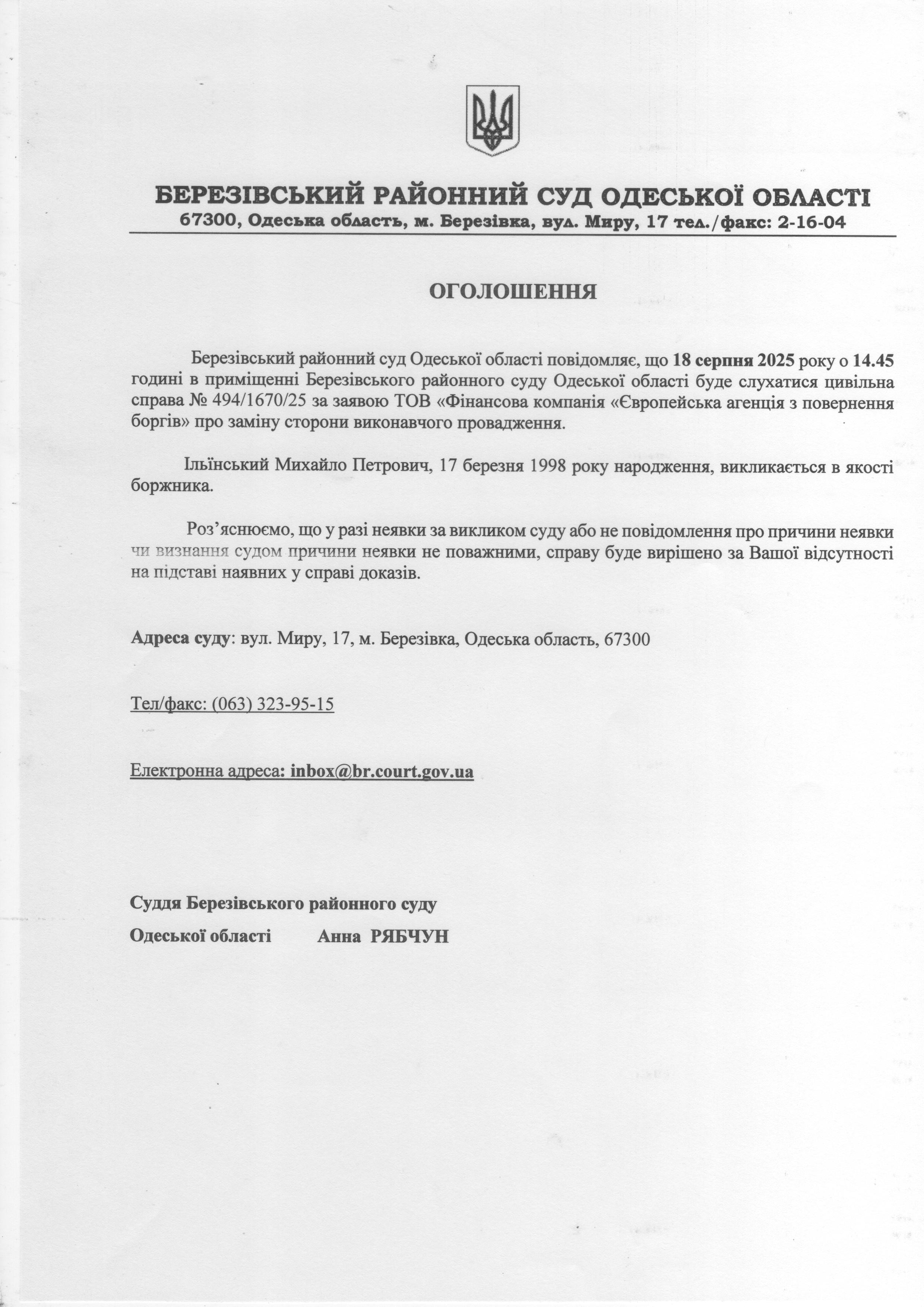 Оголошення про виклик до суду Ільїнський Михайло Петрович викликається в якості відповідача.
