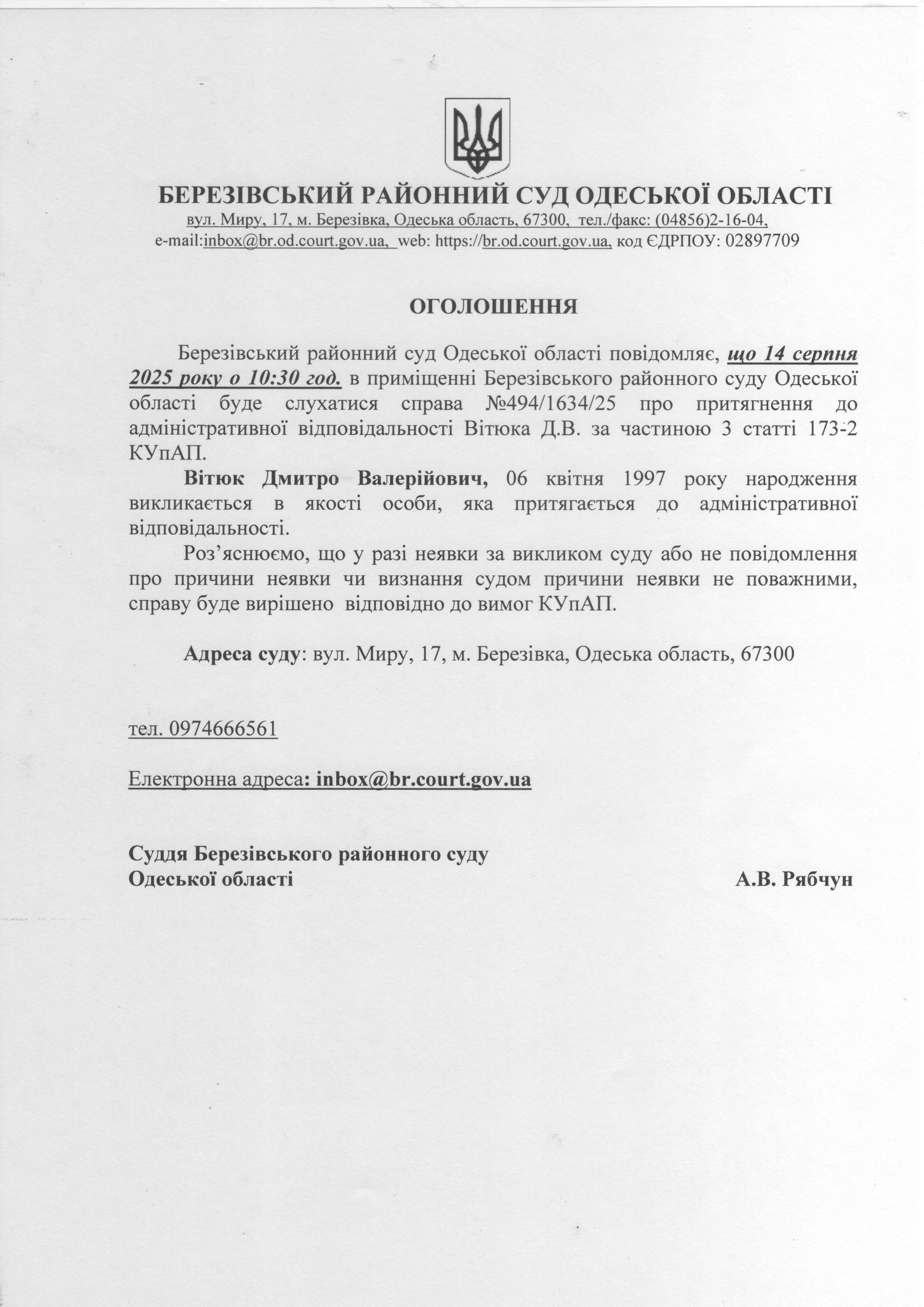 Оголошення про виклик до суду Вітюк Дмитро Валерійович в якості особи, яка притягається до адміністративної відповідальності.
