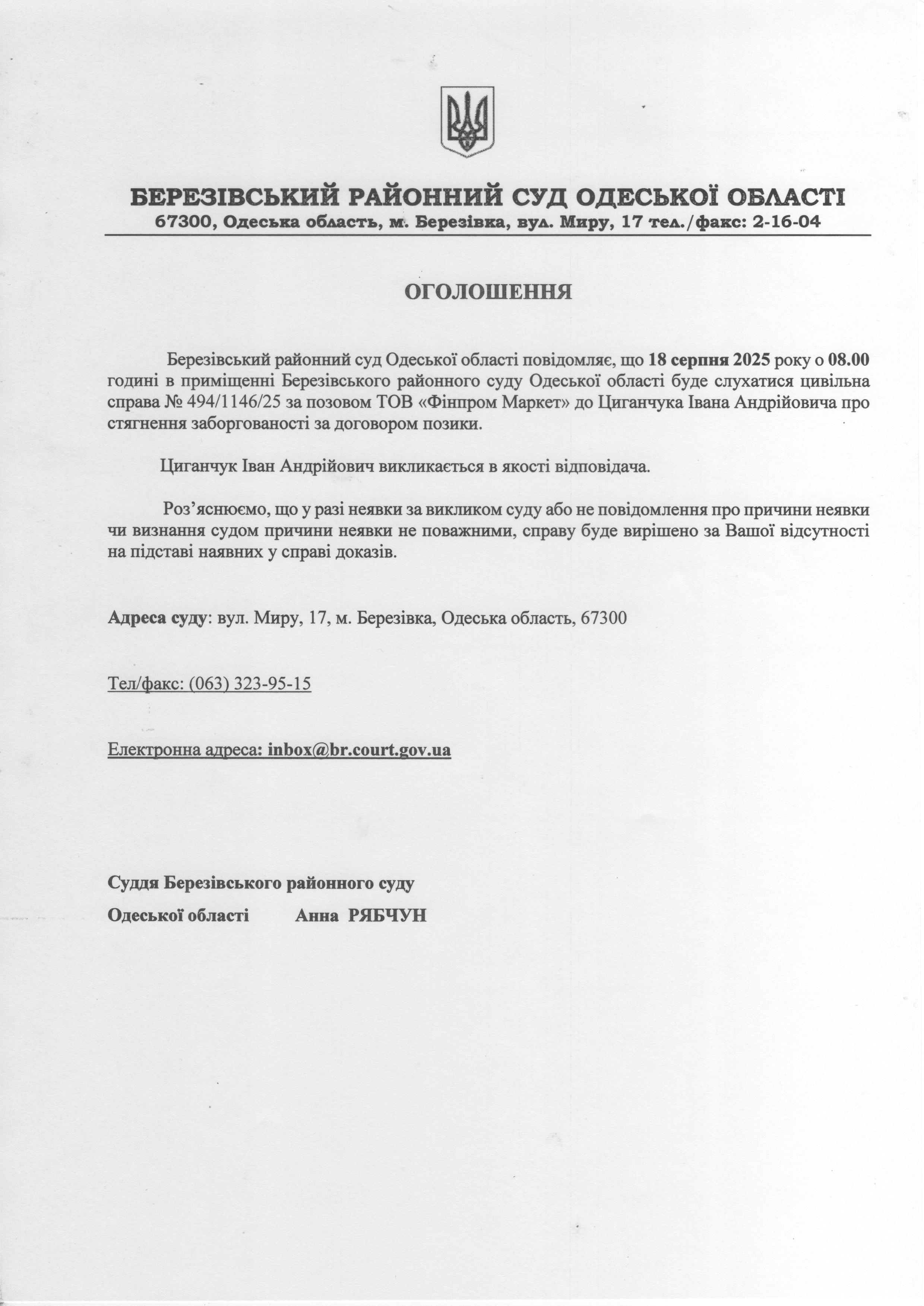 Оголошення про виклик до суду Циганчук Іван Андрійович викликається в якості відповідача.