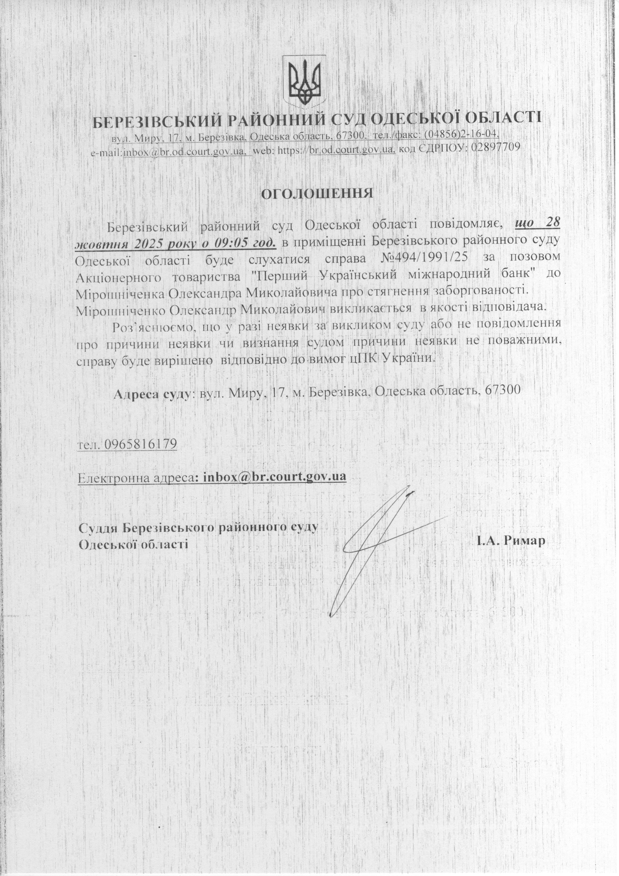 Оголошення про виклик до суду Мірошніченко Олександр Миколайович викликається в якості відповідача.