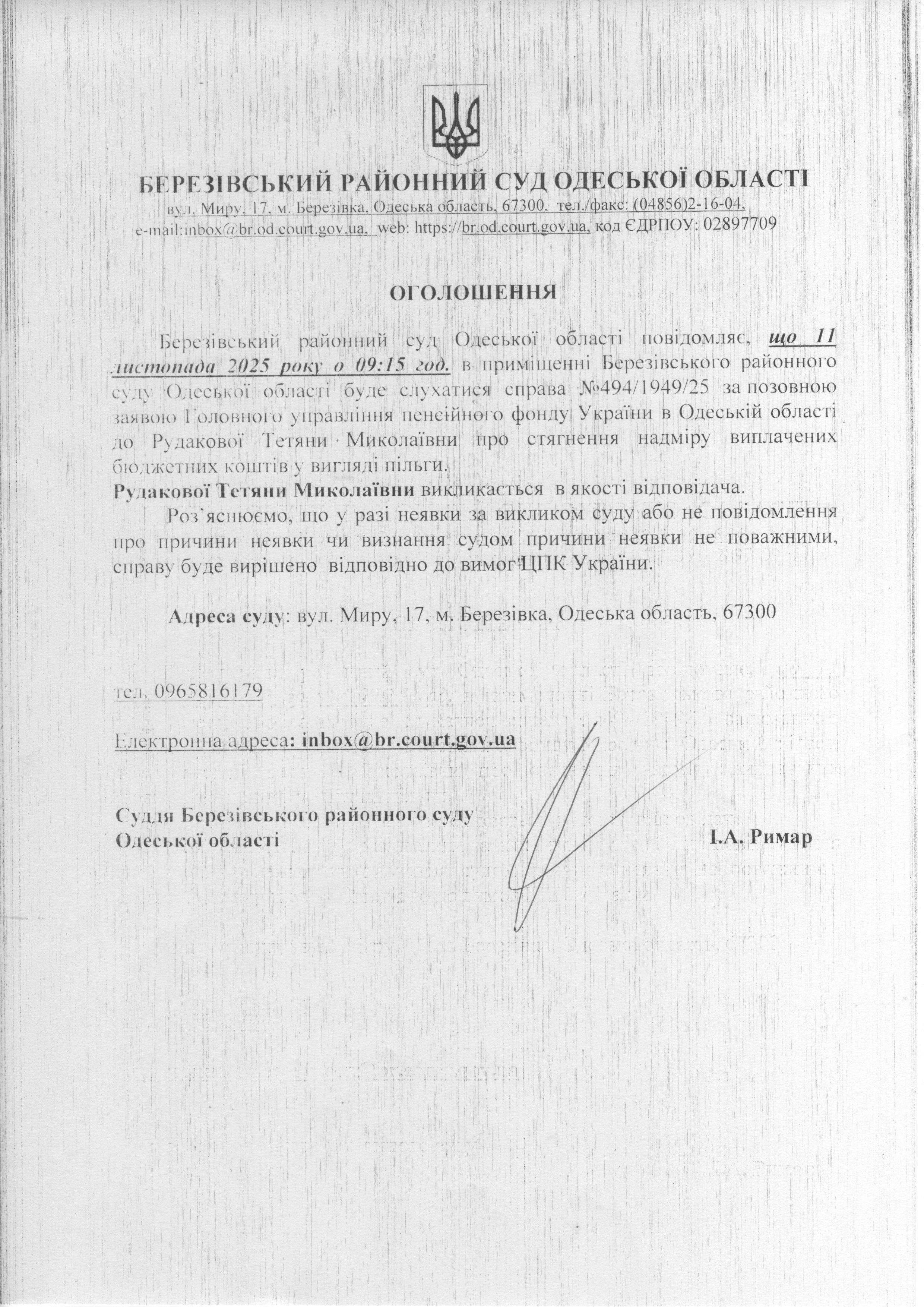 Оголошення про виклик до суду Рудакова Тетяна Миколаївна викликається в якості відповідача.