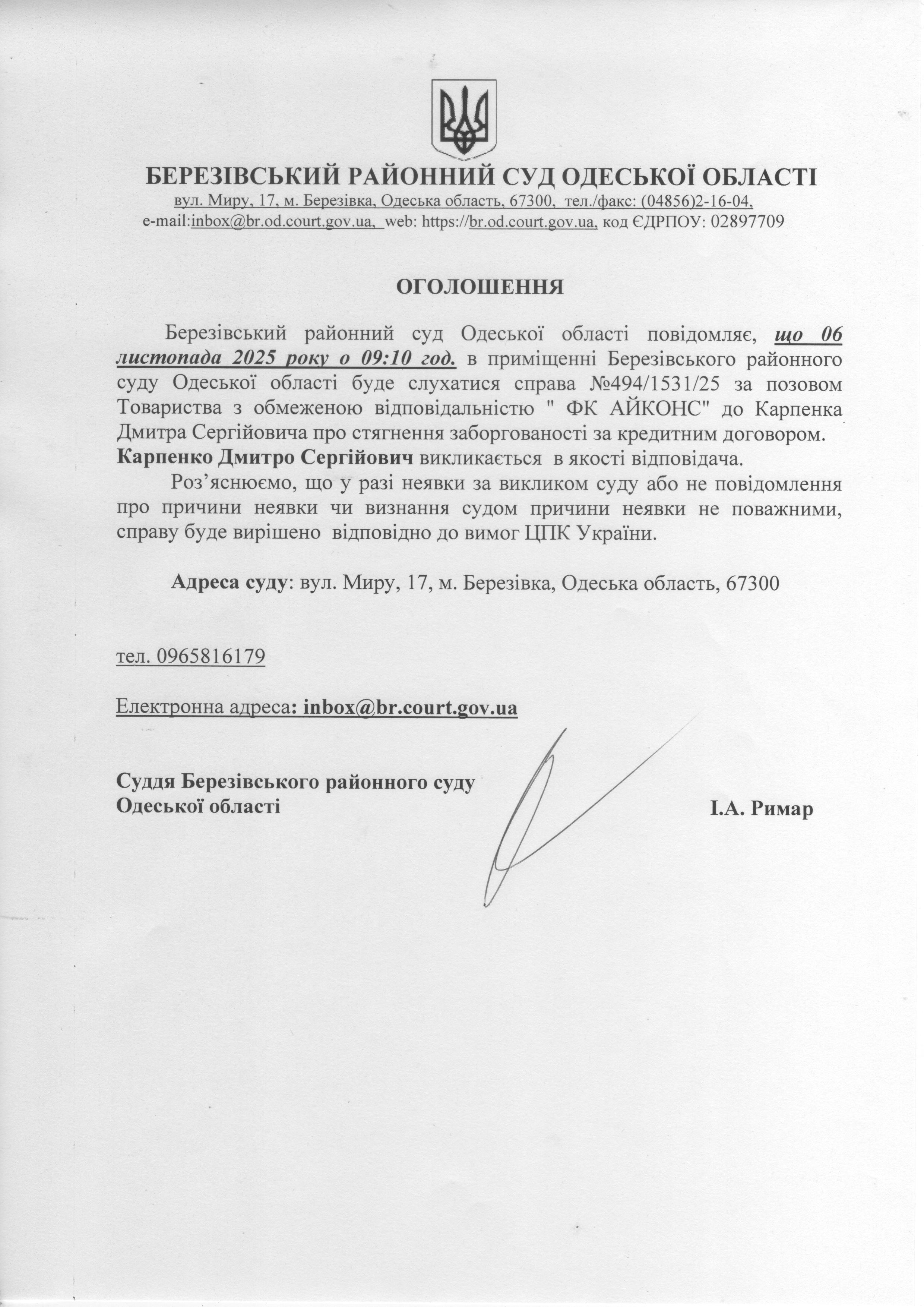 Оголошення про виклик до суду Карпенко Дмитро Сергійович викликається в якості відповідача.