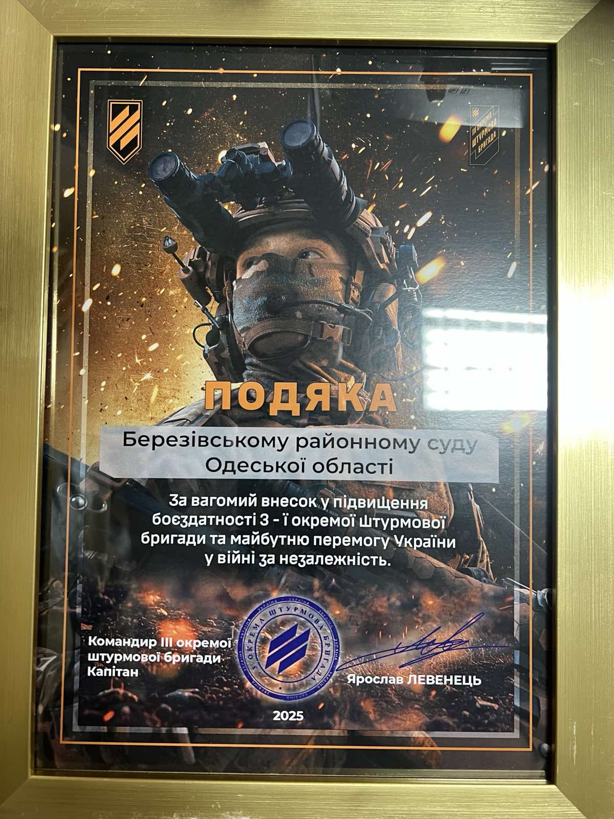 Березівському районному суду Одеської області вручено Подяку за вагомий внесок у підвищення боєздатності 3-ї окремої штурмової бригади та