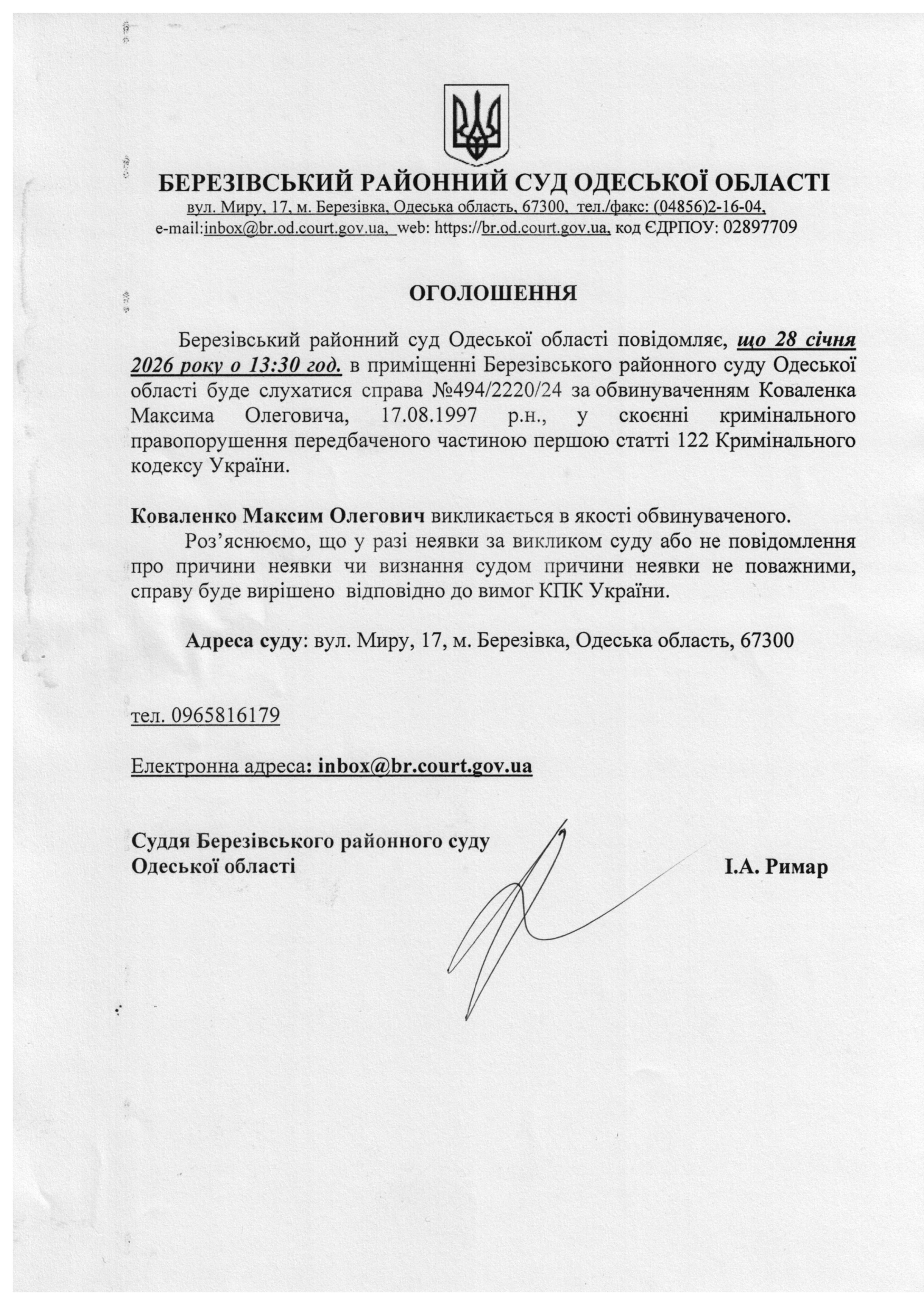 Оголошення про виклик до суду Коваленко Максим Олегович викликається в якості обвинуваченого.